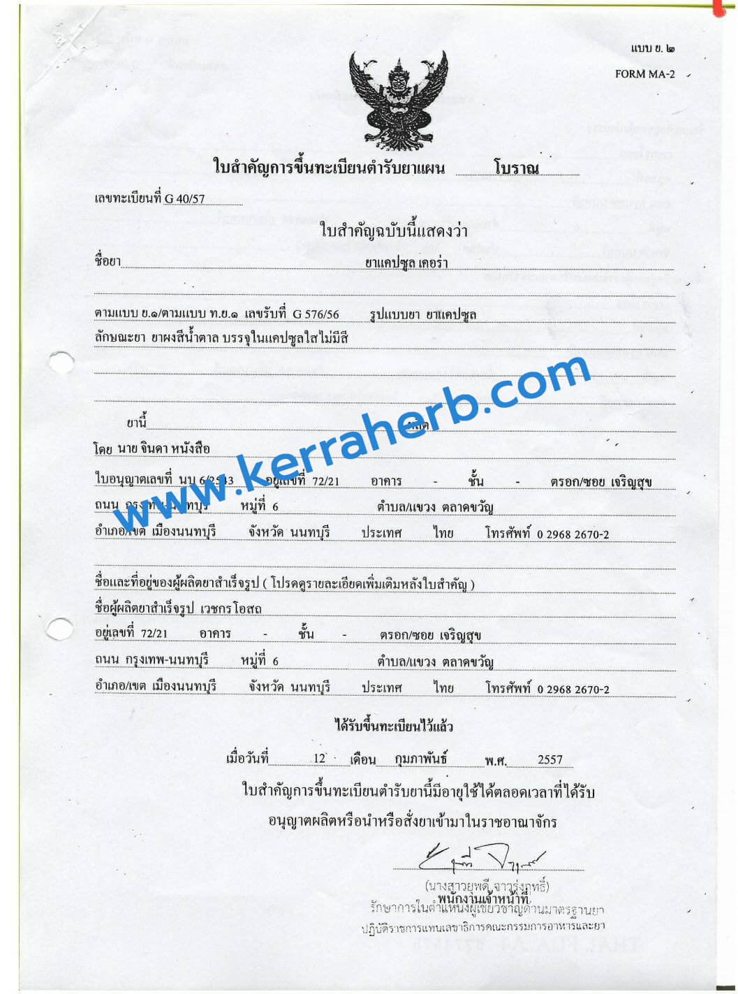 ผลการวิเคราะห์ยา เคอร่า โดยกรมวิทยาศาสตร์การแพทย์พบว่า ยาเคอร่าไม่มีส่วนประกอบของสาร ที่เป็นอันตรายต่อร่างกาย