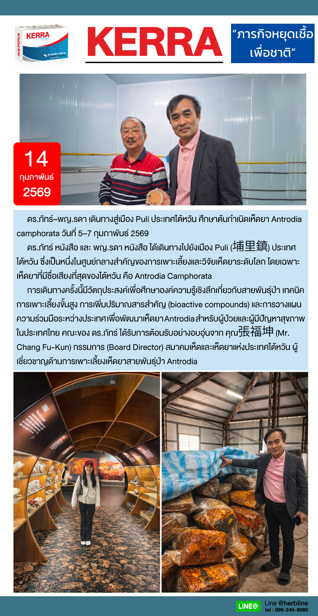 ดร.ภัทร์–พญ.รดา เดินทางสู่เมือง Puli ประเทศไต้หวัน ศึกษาต้นกำเนิดเห็ดยา Antrodia camphorata